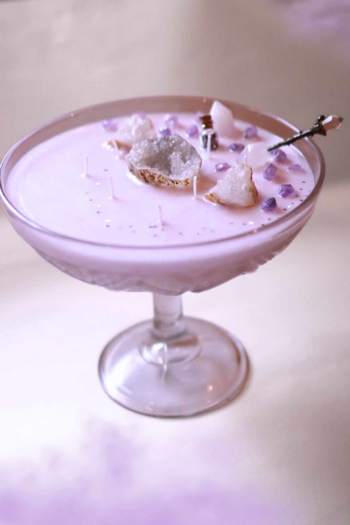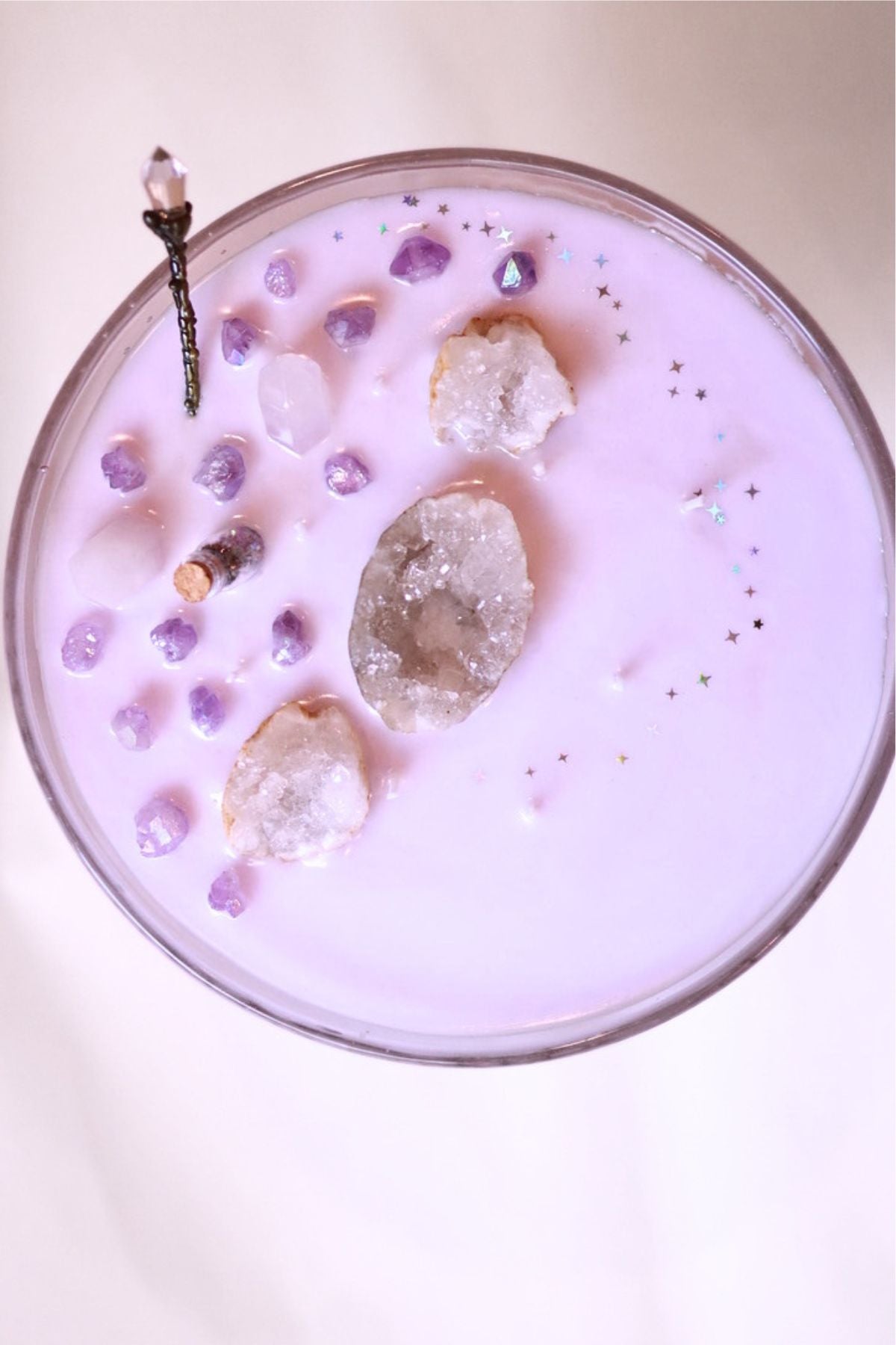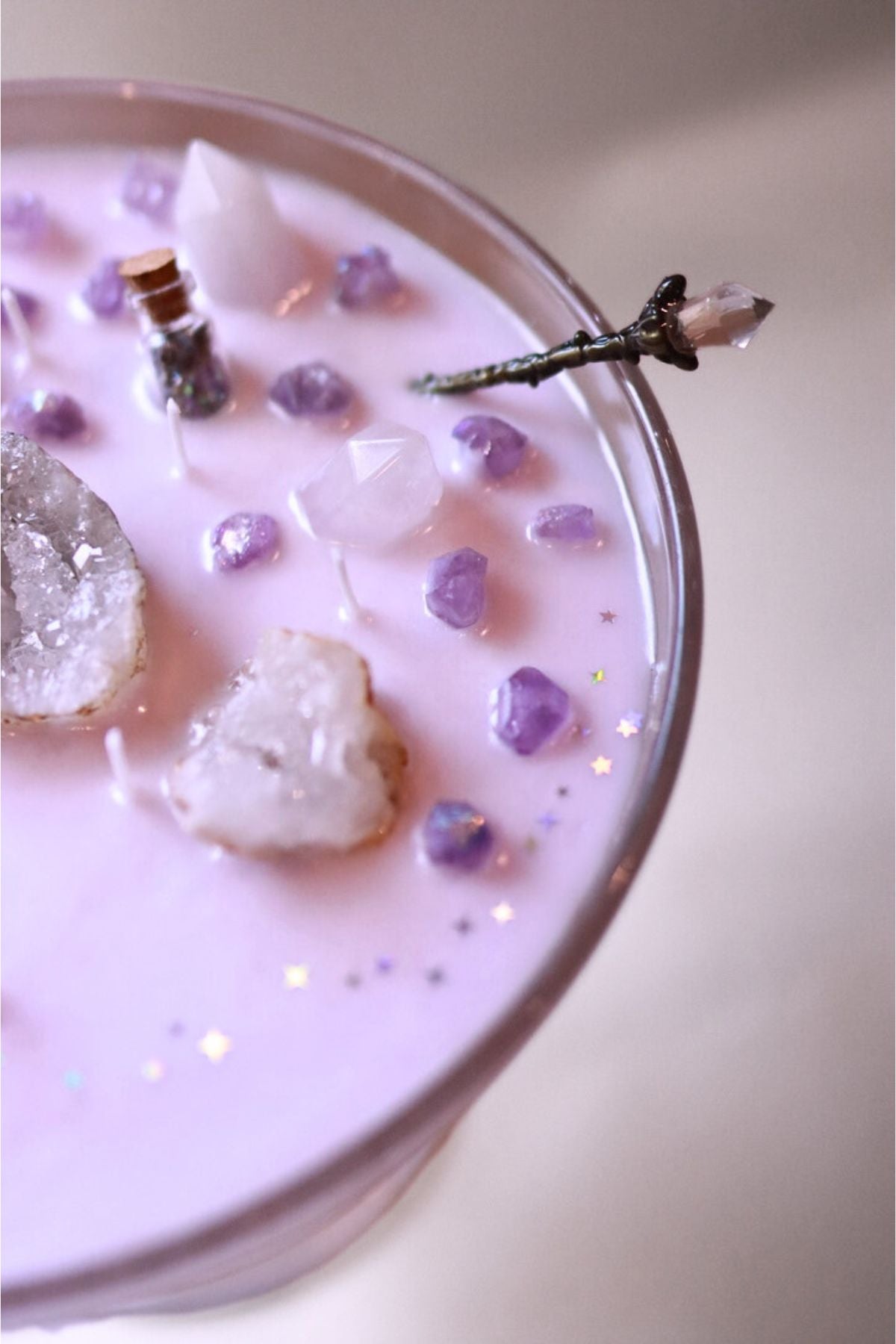 Meet your new favorite gemstone-loving queen, a large lavender candle that’s serving looks, she's dressed in the dreamiest shade of soft purple, radiating calm like it's her royal duty. This Queens topped with a crown of amethyst crystals and sprinkled with sparkling clear quartz druzy like cosmic fairy dust. She’s here to set the mood, cleanse your energy, and remind you that self-care is basically a royal ritual. Light her up, and let the magic begin.