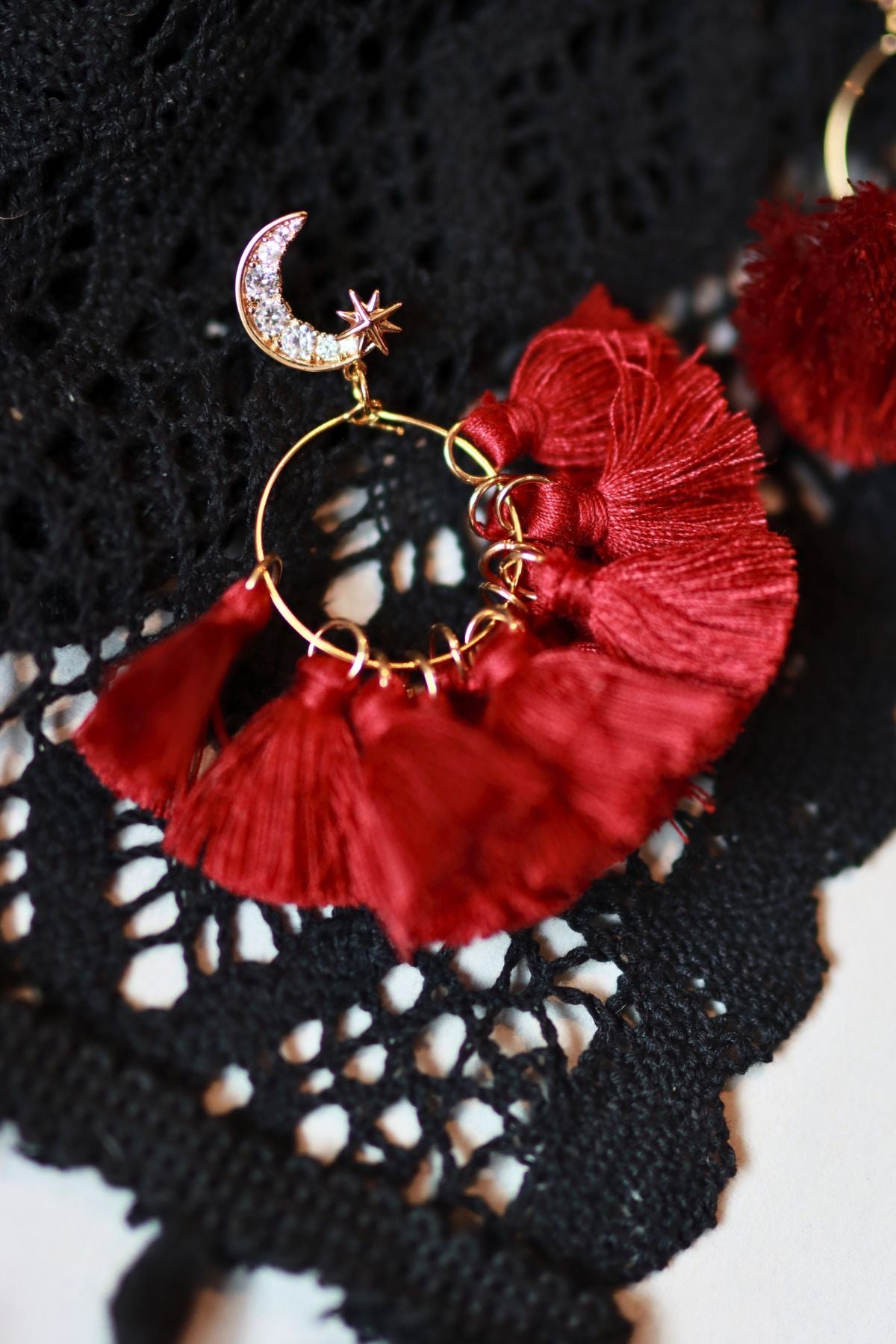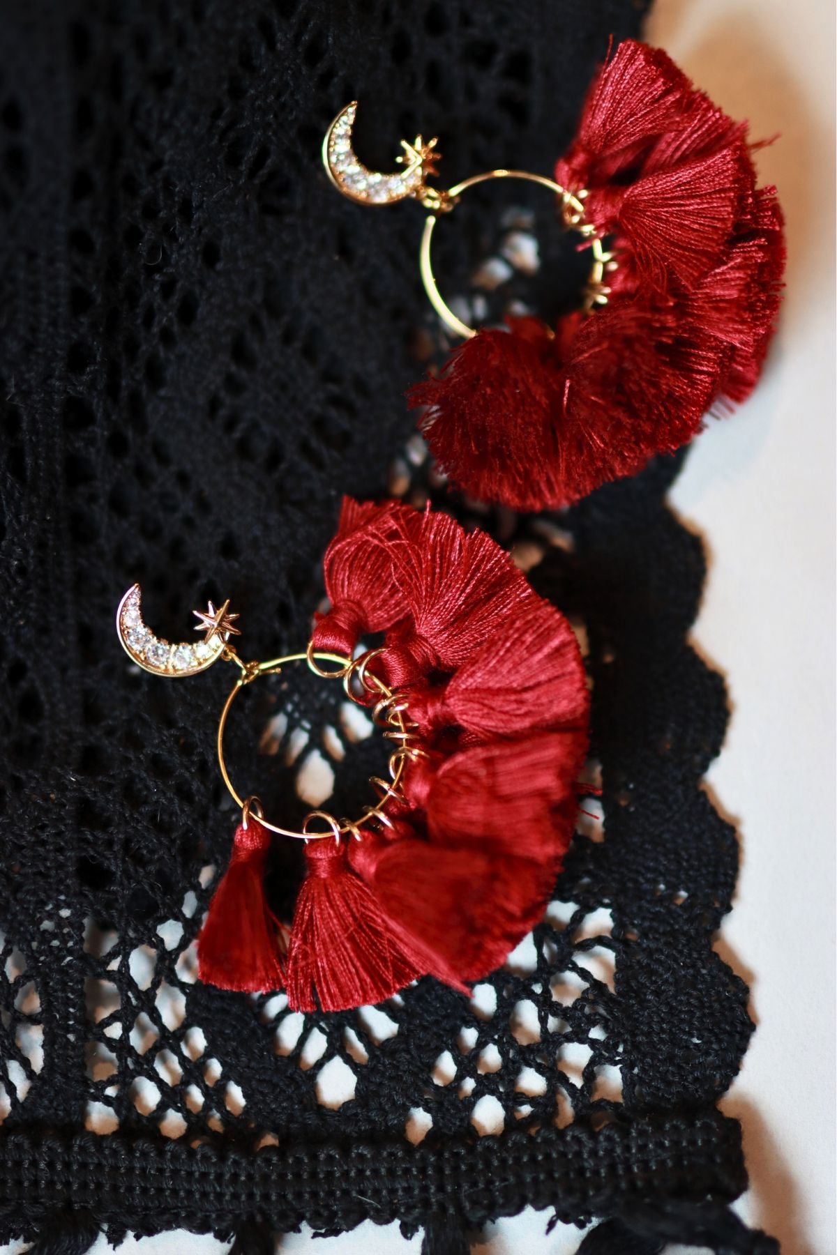 Channel lunar power with the Blood Moon Earrings — striking crescent moons paired with deep red tassels for a look that’s both mystical and rebellious. These statement pieces embody dark feminine energy, perfect for nights of magic, ritual, or raising a little hell in style.