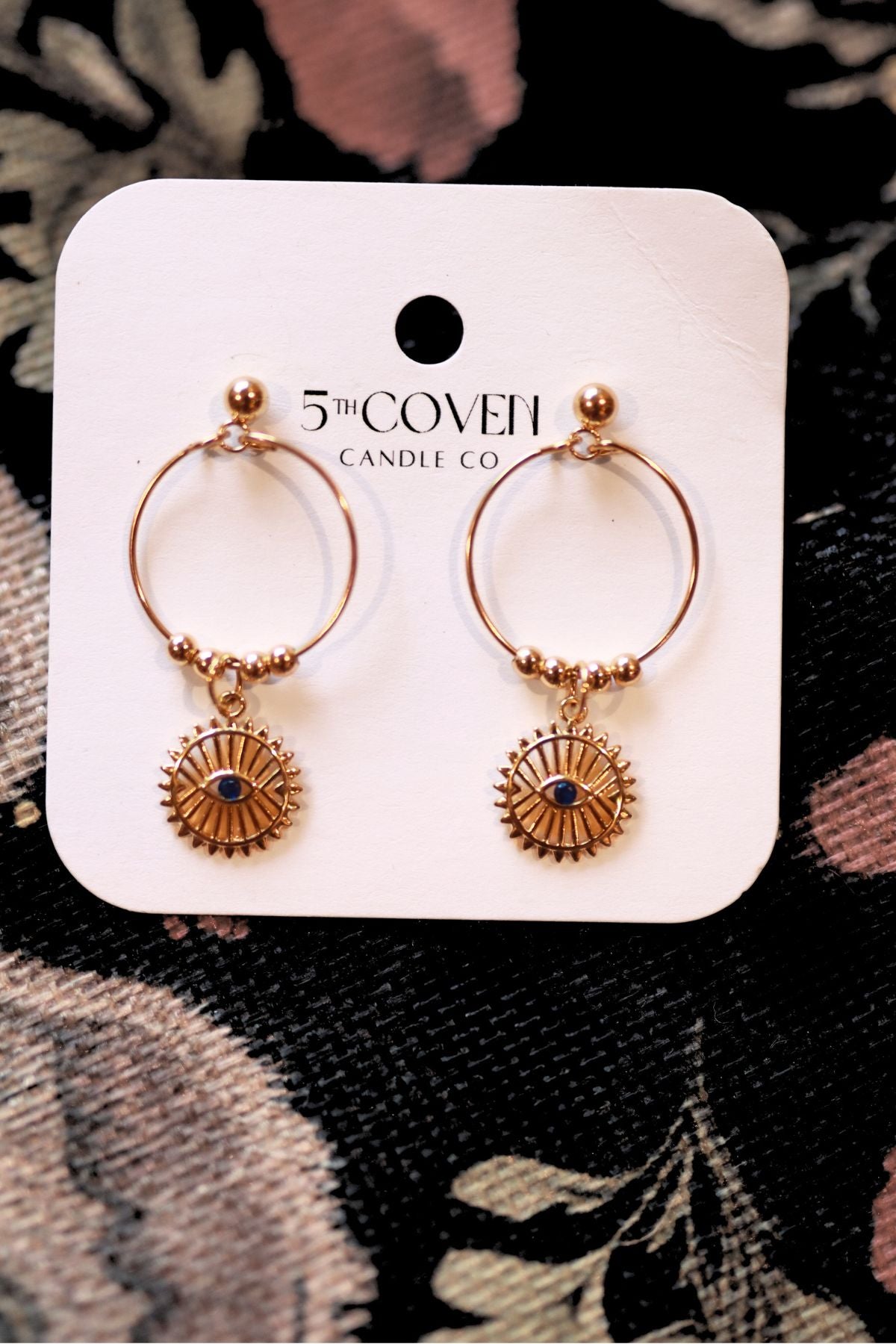 Suspended from the hoop is a finely detailed evil eye charm, an ancient symbol of warding used by witches, seers, and folk healers for centuries, the eye is ever-watchful—guarding your aura from negativity, jealousy, and energetic intrusions.
