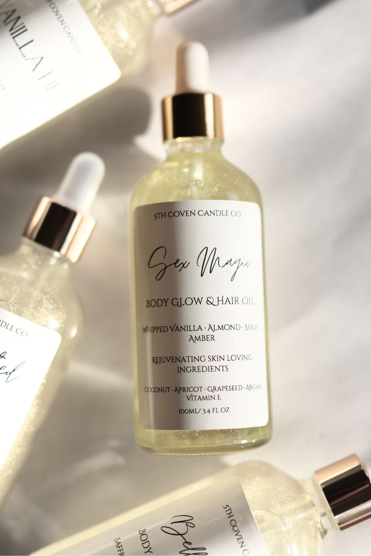 Indulge in the art of attraction with Sex Magic, a luscious body oil crafted to awaken your sensual energy and celebrate divine self-love. This clean, nourishing blend of coconut, argan, apricot, grapeseed, and vitamin E oils melts into the skin, leaving a radiant, touchable glow that feels like silk against bare skin.