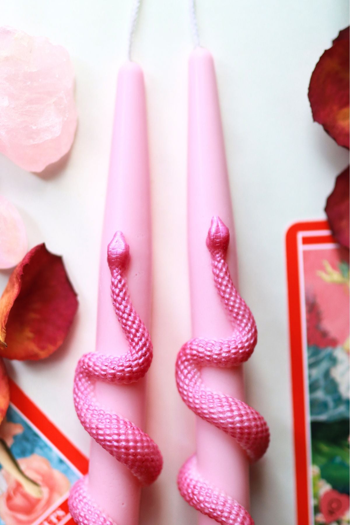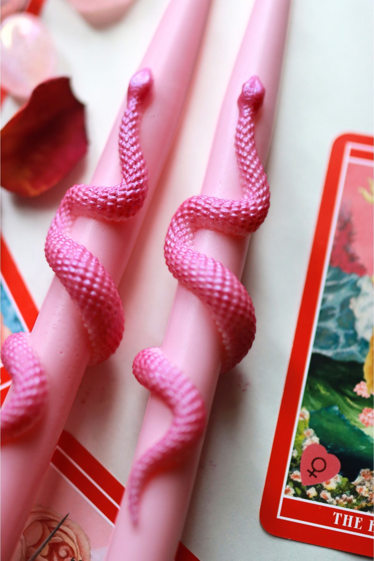Blushing pink tapers adorned with a rising serpent—sacred to desire and divine allure. Light them for glamour magic, self-love rituals, or as an offering to Aphrodite.