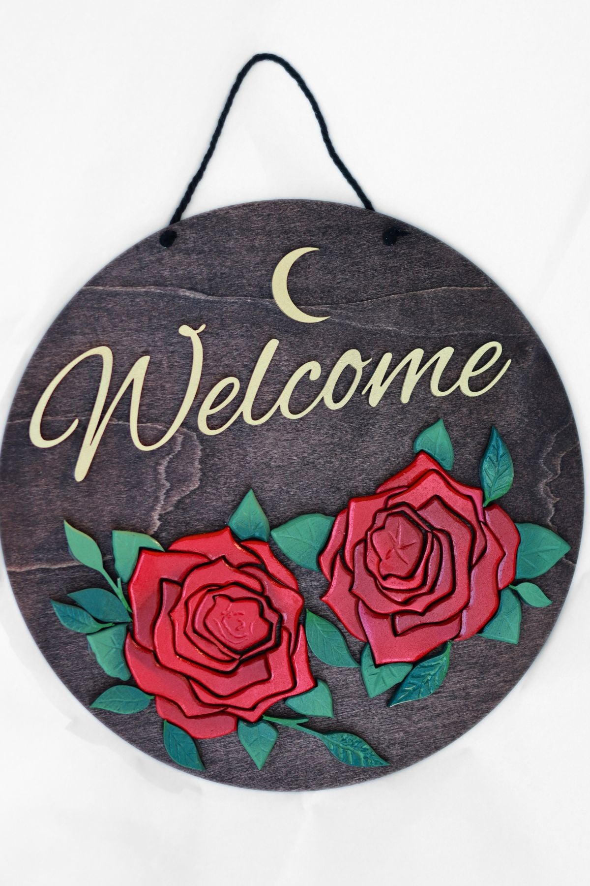 Add a touch of enchantment to your home with our handcrafted wooden sign, adorned with lush red roses, greeting your guests with spellbinding charm.